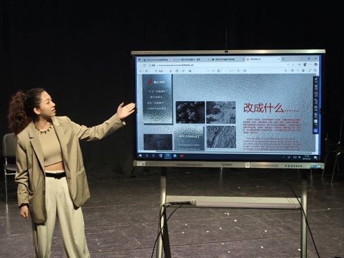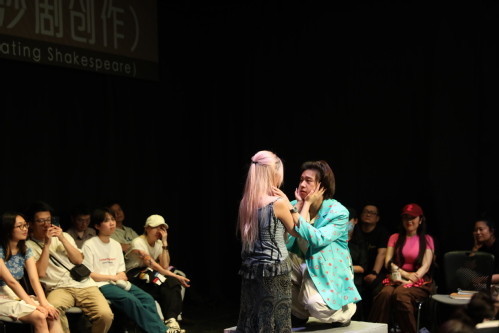 第三日的课程,同学们轮流展示排演场次,从阳台相会的浪漫段落,到滑稽调笑、充满莎士比亚式喜剧桥段的奶妈与男孩们的戏份,再到罗朱闺房分别后令人啼笑皆非的场次,都展现出了同学们的想象力和创造力。儒本教授肯定了大家的想法,并为每一组的作品提出了优化和发展的建议,鼓励同学们放开手脚,更大胆地表现莎剧的喜剧性。