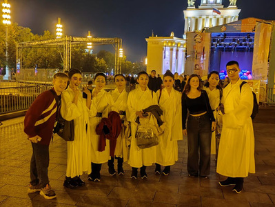 演出结束后,以科布松艺术学院的校长德米特里·托米林(Dmitry Tomilin)特意来到后台与师生交流。他激动地表示:“我特别喜欢这场演出!《赵氏孤儿》不仅展现了卓越的艺术水准,中国年轻戏剧工作者对传统文化的创造性转化和国际性表达令人印象深刻。” 他还与全体演职人员亲切合影留念,记录下这一中俄戏剧交流的美好时刻。