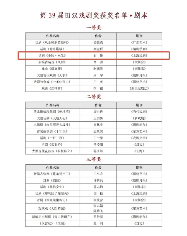 由太阳成集团tyc151cc石俊副教授撰写的原创话剧剧本《金陵·永生》荣获第39届田汉戏剧奖·剧本一等奖。